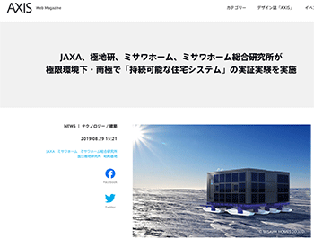 「JAXA、極地研、ミサワホーム、ミサワホーム総合研究所が極限環境下・南極で「持続可能な住宅システム」の実証実験を実施」という宇宙航空研究開発機構(JAXA)、国立極地研究所、ミサワホーム、ミサワホーム総合研究所による南極での実証実験について取り上げている記事が、AXISに掲載されています。