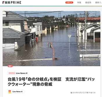 都市防災「台風19号「命の分岐点」を検証 支流が氾濫“バックウォーター”現象の脅威」という台風19号関連のニュースを取り上げている記事が、FNN.jpプライムオンラインに掲載されています。