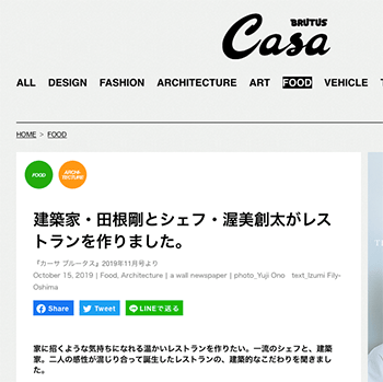 「建築家・田根剛とシェフ・渥美創太がレストランを作りました。」という記事が、カーサ ブルータスに掲載されています。