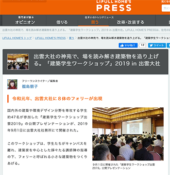 建築「出雲大社の神苑で、場を読み解き建築物を造り上げる。「建築学生ワークショップ」2019 in 出雲大社」という建築学生ワークショップ出雲2019について取り上げている記事が、LIFULL HOME’S PRESSに掲載されています。