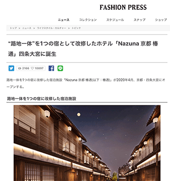 2020年4月、京都・四条大宮にオープンする宿泊施設「Nazuna 京都 椿通」の計画内容などについて取り上げている記事が、ファッションプレスに掲載されています。