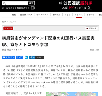 まちづくり「横須賀市がオンデマンド配車のAI運行バス実証実験、京急とドコモも参加」という神奈川県横須賀市による「AI運行バス」の実証実験に関して取り上げている記事が、新・公民連携最前線|PPPまちづくりに掲載されています。
