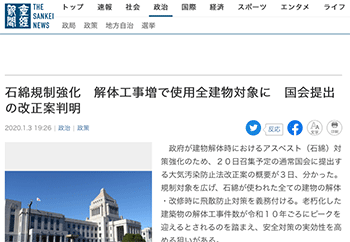 「石綿規制強化 解体工事増で使用全建物対象に 国会提出の改正案判明」という記事が、産経ニュースに掲載されています。