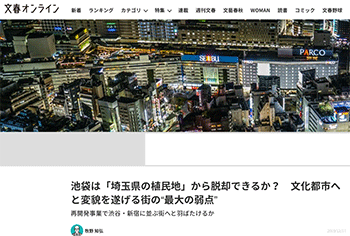 「池袋は「埼玉県の植民地」から脱却できるか? 文化都市へと変貌を遂げる街の“最大の弱点”」という牧野 知弘による記事が、文春オンラインに掲載されています。