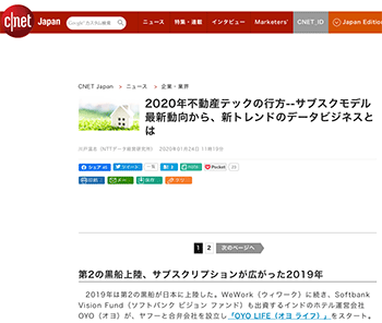 不動産動向「2020年不動産テックの行方–サブスクモデル最新動向から、新トレンドのデータビジネスとは」という記事が、CNET Japanに掲載されています。