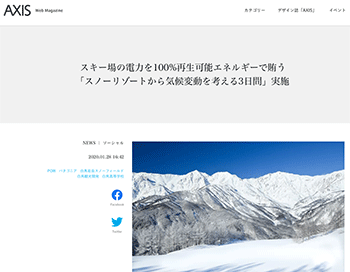 まちづくり「スキー場の電力を100%再生可能エネルギーで賄う「スノーリゾートから気候変動を考える3日間」実施」⻑野県白馬村での白馬観光開発の取り組みについて取り上げている記事が、AXISに掲載されています。