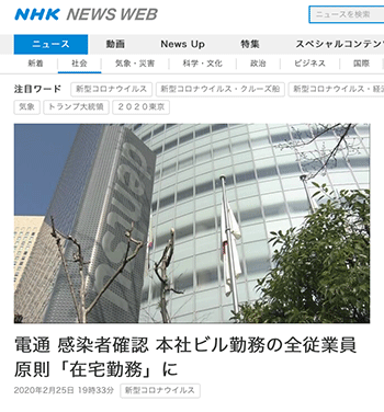 →『電通 感染者確認 本社ビル勤務の全従業員 原則「在宅勤務」に』