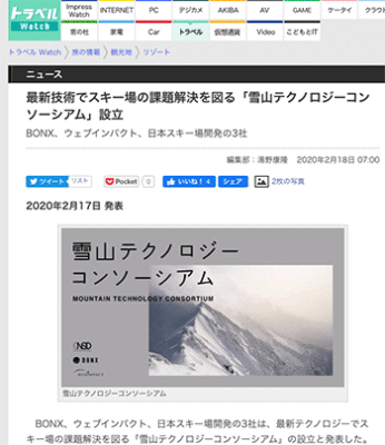 「最新技術でスキー場の課題解決を図る「雪山テクノロジーコンソーシアム」設立」というBONX、ウェブインパクト、日本スキー場開発の取り組みについて取り上げている記事が、トラベル Watchに掲載されています。