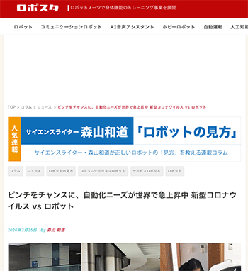 ロボット&ドローン「ピンチをチャンスに、自動化ニーズが世界で急上昇中 新型コロナウイルス vs ロボット」という記事が、ロボスタに掲載されています。
