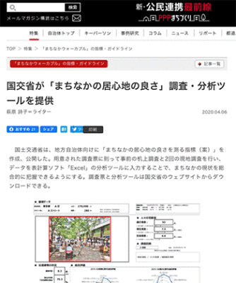 まちづくり「国交省が「まちなかの居心地の良さ」調査・分析ツールを提供」という国土交通省の取り組みについて取り上げている記事が、新・公民連携最前線|PPPまちづくりに掲載されています。