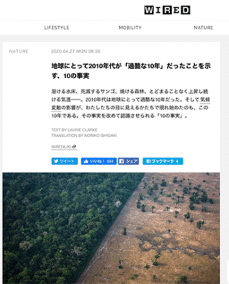 アラカルト「地球にとって2010年代が「過酷な10年」だったことを示す、10の事実」という記事が、WIRED.jpに掲載されています。