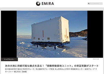 「氷の大地に持続可能な拠点を造る!「南極移動基地ユニット」の実証実験がスタート」という国立極地研究所の本山秀明教授と樋口和生氏に話を聞いている記事が、EMIRAに掲載されています。