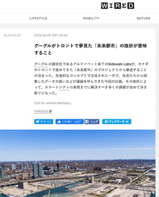 →『グーグルがトロントで夢見た「未来都市」の挫折が意味すること 』
