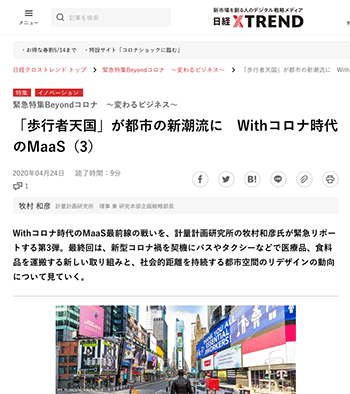 まちづくり「「歩行者天国」が都市の新潮流に Withコロナ時代のMaaS(3)」という計量計画研究所の牧村和彦氏による記事が、日経クロストレンドに掲載されています。