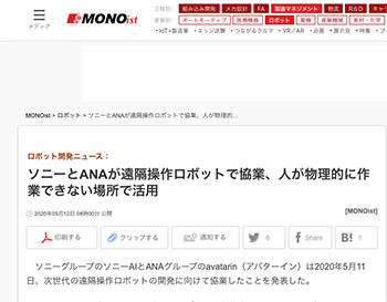 「ソニーとANAが遠隔操作ロボットで協業、人が物理的に作業できない場所で活用」というソニーグループのソニーAIとANAグループのavatarin(アバターイン)による取り組みについて取り上げている記事が、MONOistに掲載されています。