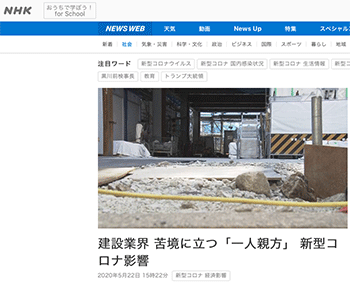 まちづくり「建設業界 苦境に立つ「一人親方」 新型コロナ影響」という記事が、NHKニュースに掲載されています。
