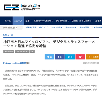 まちづくり「神戸市と日本マイクロソフト、デジタルトランスフォーメーション推進で協定を締結」という神戸市と日本マイクロソフトの取り組みについて取り上げている記事が、エンタープライズジンに掲載されています。