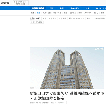 「新型コロナで密集防ぐ 避難所確保へ都がホテル旅館団体と協定」という東京都の取り組みについて取り上げている記事が、NHKニュースに掲載されています。