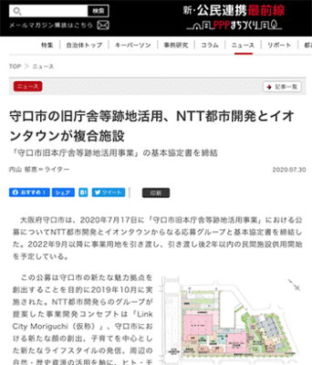 まちづくり「守口市の旧庁舎等跡地活用、NTT都市開発とイオンタウンが複合施設」という大阪府守口市の旧庁舎等跡地活用に関するニュースを取り上げている記事が、新・公民連携最前線|PPPまちづくりに掲載されています。