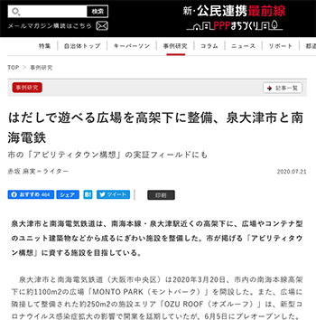 まちづくり「はだしで遊べる広場を高架下に整備、泉大津市と南海電鉄」という泉大津市と南海電気鉄道の取り組みについて取り上げている記事が、新・公民連携最前線|PPPまちづくりに掲載されています。