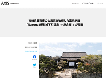 宮崎県日南市の重要伝統的建造物群保存地区に開業した全5室の温泉旅館「Nazuna 飫肥 城下町温泉 -小鹿倉邸-」について取り上げている記事が、AXISに掲載されています。
