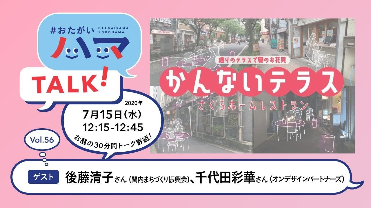 #おたがいハマ トーク vol.56は、関内まちづくり振興会理事の後藤清子さんと、オンデザインパートナーズの千代田彩華さんに、関内さくら通りの一部を歩行者天国にし、道路にテラス席を設置、近くの飲食店をテイクアウトで利用できる「関内テラス」についてお聞きします。
