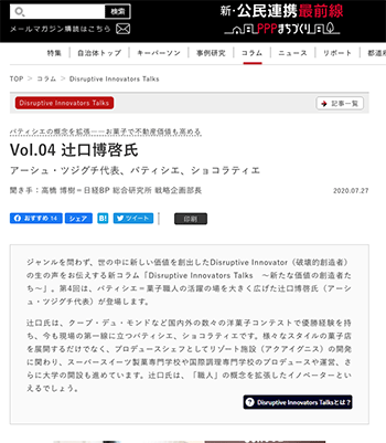 「Disruptive Innovators Talks Vol.04 辻口博啓氏」という記事が、新・公民連携最前線|PPPまちづくり に掲載されています。