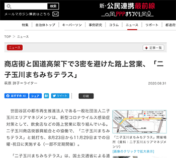 まちづくり「商店街と国道高架下で3密を避けた路上営業、「二子玉川まちみちテラス」」という東京の二子玉川での取り組みについて取り上げている記事が、新・公民連携最前線|PPPまちづくりに掲載されています。