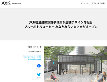 芦沢啓治建築設計事務所が店舗デザインを担当したブルーボトルコーヒーの横浜エリア2号店「ブルーボトルコーヒー みなとみらいカフェ」について取り上げている記事が、AXISに掲載されています。