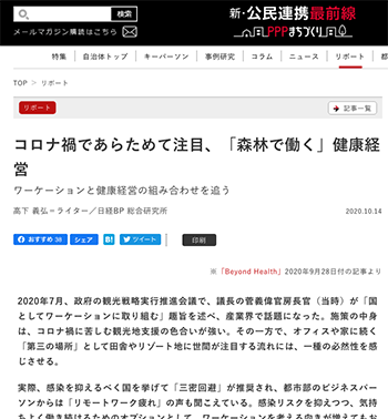 まちづくり「コロナ禍であらためて注目、「森林で働く」健康経営」という記事が新・公民連携最前線|PPPまちづくりに掲載されています。
