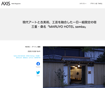 建築「現代アートと古美術、工芸を融合した一日一組限定の宿 三重・桑名「MARUYO HOTEL semba」」という記事が、AXISに掲載されています。