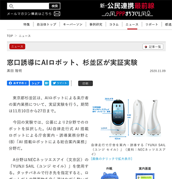 ロボット&ドローン「窓口誘導にAIロボット、杉並区が実証実験」という杉並区の取り組みについて取り上げている記事が、新・公民連携最前線|PPPまちづくりに掲載されています。