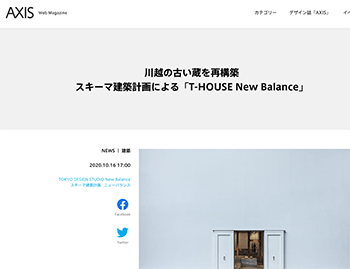 「川越の古い蔵を再構築 スキーマ建築計画による「T-HOUSE New Balance」」というスキーマ建築計画が手掛けたプロジェクト「T-HOUSE New Balance」について取り上げている記事が、AXISに掲載されています。