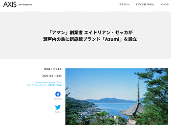 「「アマン」創業者 エイドリアン・ゼッカが瀬戸内の島に新旅館ブランド「Azumi」を設立」という記事が、AXISに掲載されています。