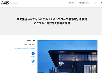 「芦沢啓治がカプセルホテル「ナインアワーズ 博多駅」を設計 ミニマルと開放感を同時に提供」という九州地区では2店舗目となる「ナインアワーズ 博多駅」(内装設計は芦沢啓治氏)について取り上げている記事が、AXISに掲載されています。