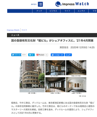 まちづくり「国の登録有形文化財「堀ビル」がシェアオフィスに。’21年4月開業」という堀商店、竹中工務店、グッドルームによる、東京都港区新橋にある国の登録有形文化財「堀ビル」の保存活用事業について取り上げている記事が、Impress Watchに掲載されています。