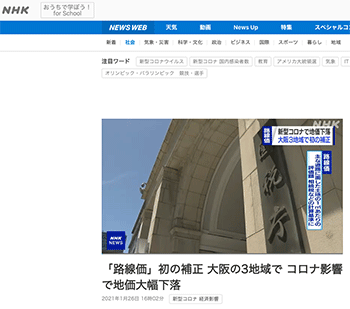 「「路線価」初の補正 大阪の3地域で コロナ影響で地価大幅下落」という大阪でのニュースを取り上げている動画ニュースが、NHKニュースにて公開されています。