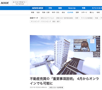 「不動産売買の「重要事項説明」 4月からオンラインでも可能に」という国土交通省の方針について取り上げている記事が、NHKニュースに掲載されています。