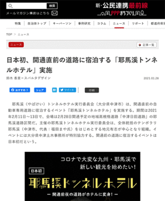 「日本初、開通直前の道路に宿泊する「耶馬溪トンネルホテル」実施」という大分県での開通前の道路に宿泊するイベントについて取り上げている記事が、新・公民連携最前線|PPPまちづくりに掲載されています。