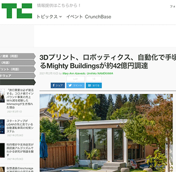 「3Dプリント、ロボッティクス、自動化で手頃な価格の家を建てるMighty Buildingsが約42億円調達」という記事が、TechCrunch Japanに掲載されています。