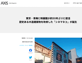 「東京・青梅に映画館が約50年ぶりに復活 歴史ある木造建築物を改修した「シネマネコ」が誕生」という記事が、AXISに掲載されています。