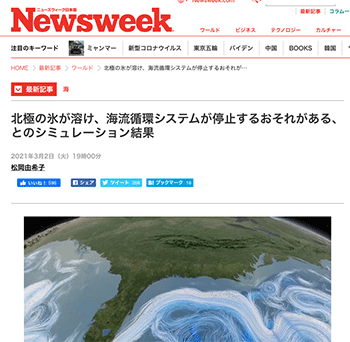 アラカルト「北極の氷が溶け、海流循環システムが停止するおそれがある、とのシミュレーション結果」という記事が、ニューズウィーク日本版に掲載されています。
