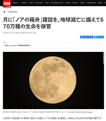 「月に「ノアの箱舟」建設を、地球滅亡に備えて670万種の生命を保管」というアメリカ、アリゾナ大学の研究チームによる提案について取り上げている記事が、CNN.co.jpに掲載されています。