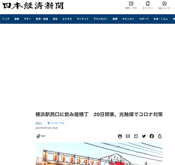 「横浜駅西口に飲み屋横丁 20日開業、光触媒でコロナ対策」という横浜駅西口の飲み屋横丁「横浜西口一番街」の取り組みについて取り上げている記事が、日本経済新聞に掲載されています。
