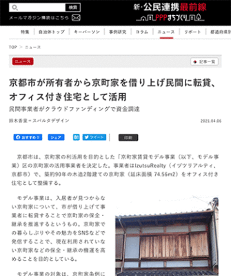 「京都市が所有者から京町家を借り上げ民間に転貸、オフィス付き住宅として活用」という京都市の取り組みについて取り上げている記事が、新・公民連携最前線|PPPまちづくりに掲載されています。