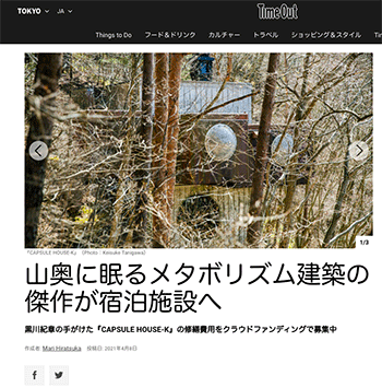 「山奥に眠るメタボリズム建築の傑作が宿泊施設へ 黒川紀章の手がけた『CAPSULE HOUSE-K』の修繕費用をクラウドファンディングで募集中」という黒川紀章の手がけた『CAPSULE HOUSE-K』に関する記事が、タイムアウト東京に掲載されています。