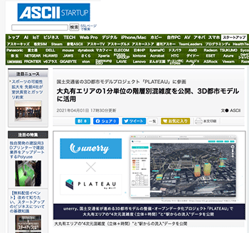 プロダクト・設備「大丸有エリアの1分単位の階層別混雑度を公開、3D都市モデルに活用」という記事が、ASCII.jpに掲載されています。