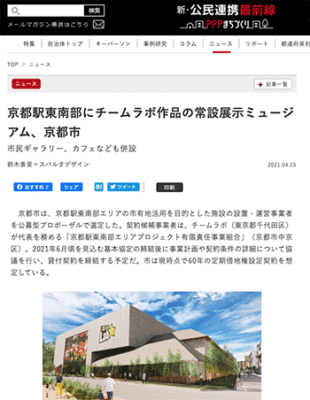 まちづくり「京都駅東南部にチームラボ作品の常設展示ミュージアム、京都市」という京都市でのニュースを取り上げている記事が、新・公民連携最前線|PPPまちづくりに掲載されています。