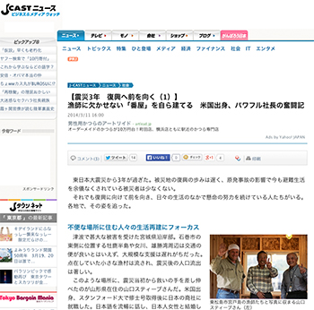 都市防災山形県在住の山口スティーブさんの活動を追った連載記事「震災3年 復興へ前を向く(1)ー 漁師に欠かせない「番屋」を自ら建てる 米国出身、パワフル社長の奮闘記」がJ-CASTニュースに掲載されています。