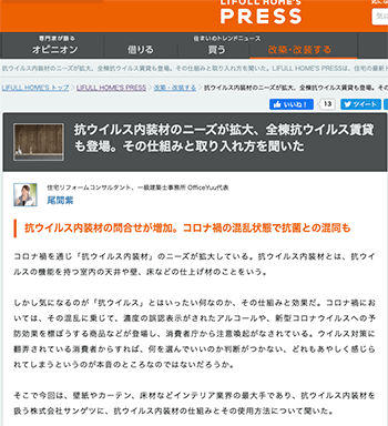 インテリア・グッズ「抗ウイルス内装材のニーズが拡大、全棟抗ウイルス賃貸も登場。その仕組みと取り入れ方を聞いた」というサンゲツの取り組みについて取り上げている記事が、LIFULL HOME’S PRESSに掲載されています。